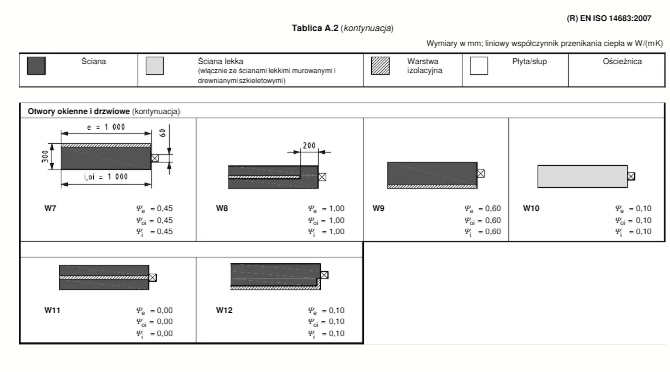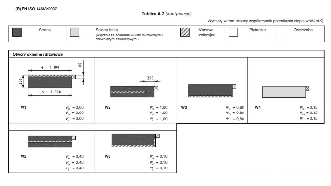 W6 oznacza montaż w licu zewnętrznym ściany przy współczynniku Ψ = 0,10. W tym schemacie izolacja znajduje się od wewnątrz budynku i kończy się na ościeżnicy okna lub drzwi. Straty ciepła wynoszą 0,10 W/[*K], dlatego jest to jedno z lepszych rozwiązań. Taki montaż praktycznie niweluje mostki termiczne. Trzeba jednak pamiętać, że izolację od wewnątrz stosuje się zazwyczaj jedynie w budynkach zabytkowych, gdy konserwator nie pozwala ocieplić budynku od zewnątrz. W zwykłych warunkach taka metoda nie jest zalecana.