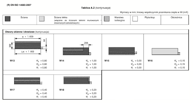 W18 oznacza montaż w licu wewnętrznym ściany przy współczynniku Ψ = 0,20. W tym schemacie izolacja znajduje się na zewnątrz budynku i kończy się przy ościeżnicy okna lub drzwi. Straty ciepła dla przegrody wynoszą 0,20 W/[*K], dlatego jest to jedno z lepszych rozwiązań. Taki sposób usytuowania stolarki praktycznie ogranicza mostki termiczne.